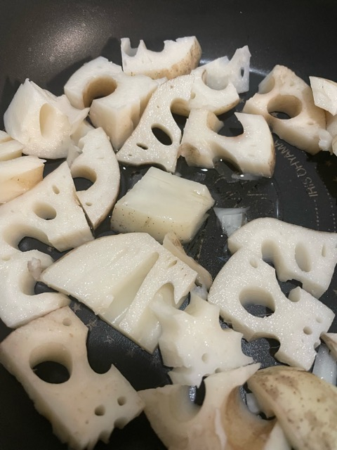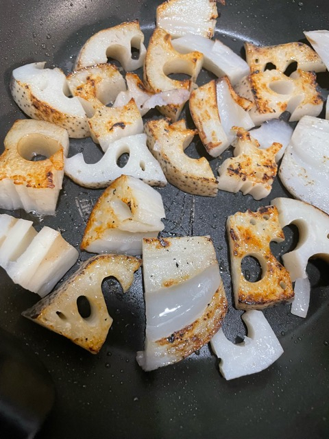 油をひいて強めの中火。蓮根を入れて動かさず2分以上焼く