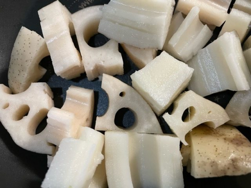 蓮根をよく洗い、上下を切り、厚めに切る(皮は剥かない/水にさらさない)